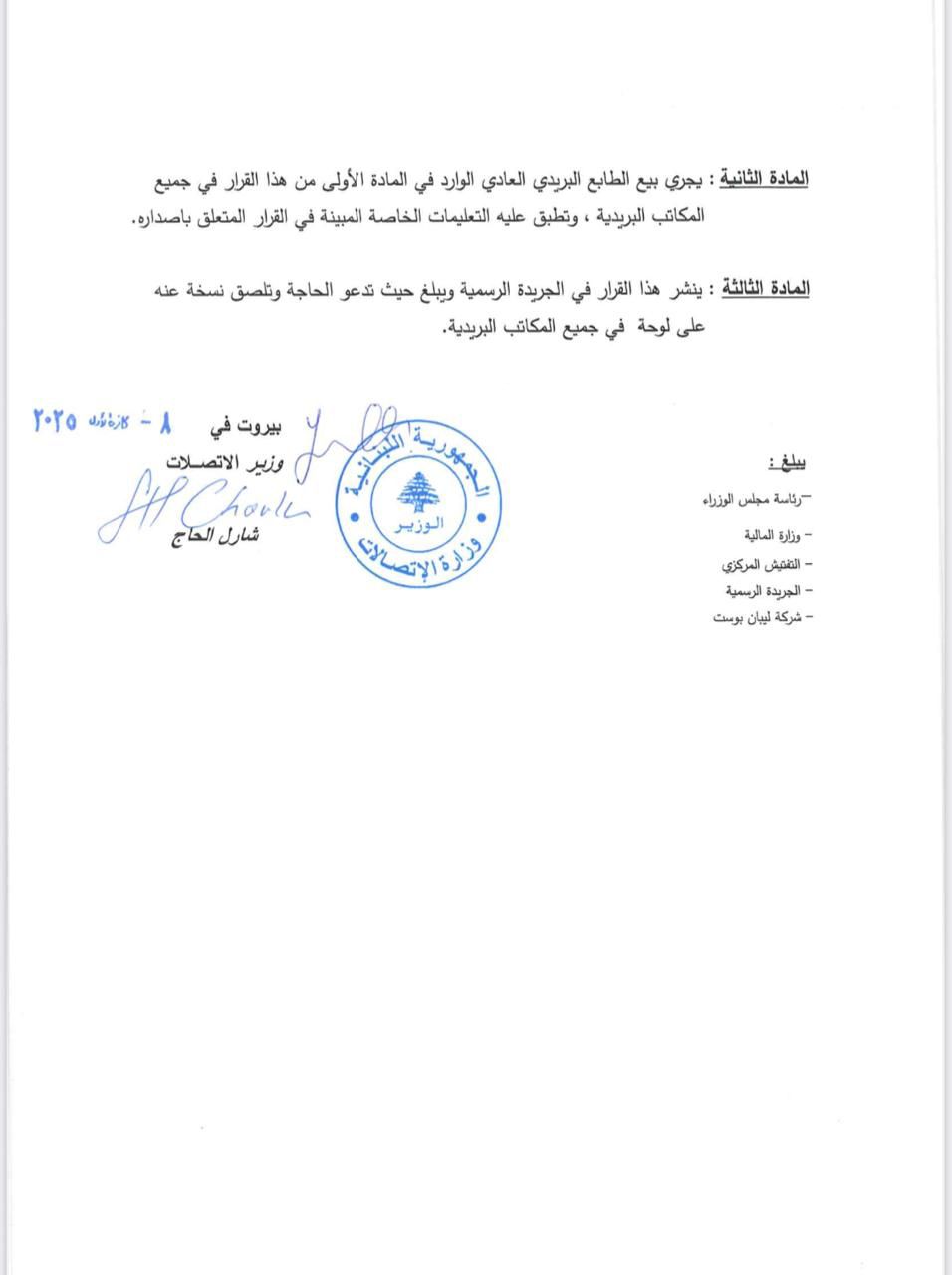 وقّع وزير الاتّصالات شارل الحاج قرارًا يقضي بوضع طابع بريدي خاص بالفنان زياد الرحباني في التّداول، يتضمّن أربع صور توثّق محطات من مسيرته الفنية. ومن المقرر أن يبدأ العمل بهذا الطابع رسميًا اعتبارًا من يوم الأربعاء المقبل.