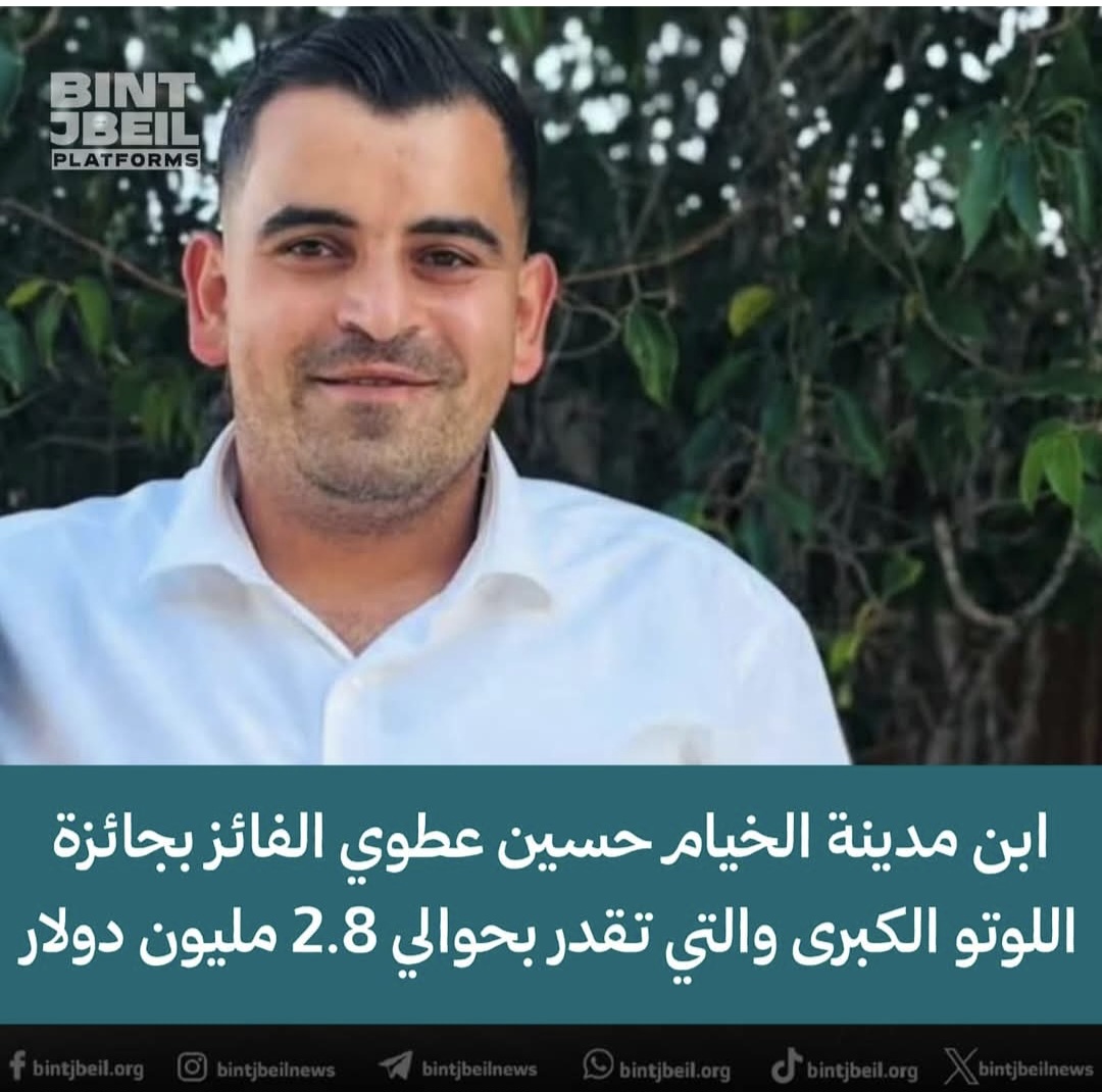 الفائز بجائزة اللوتو الكبرى ابن مدينة الخيام حسين عطوي وهو جندي في الجيش اللبناني.. وتقدر الجائزة بحوالي 2.8 مليون دولار
