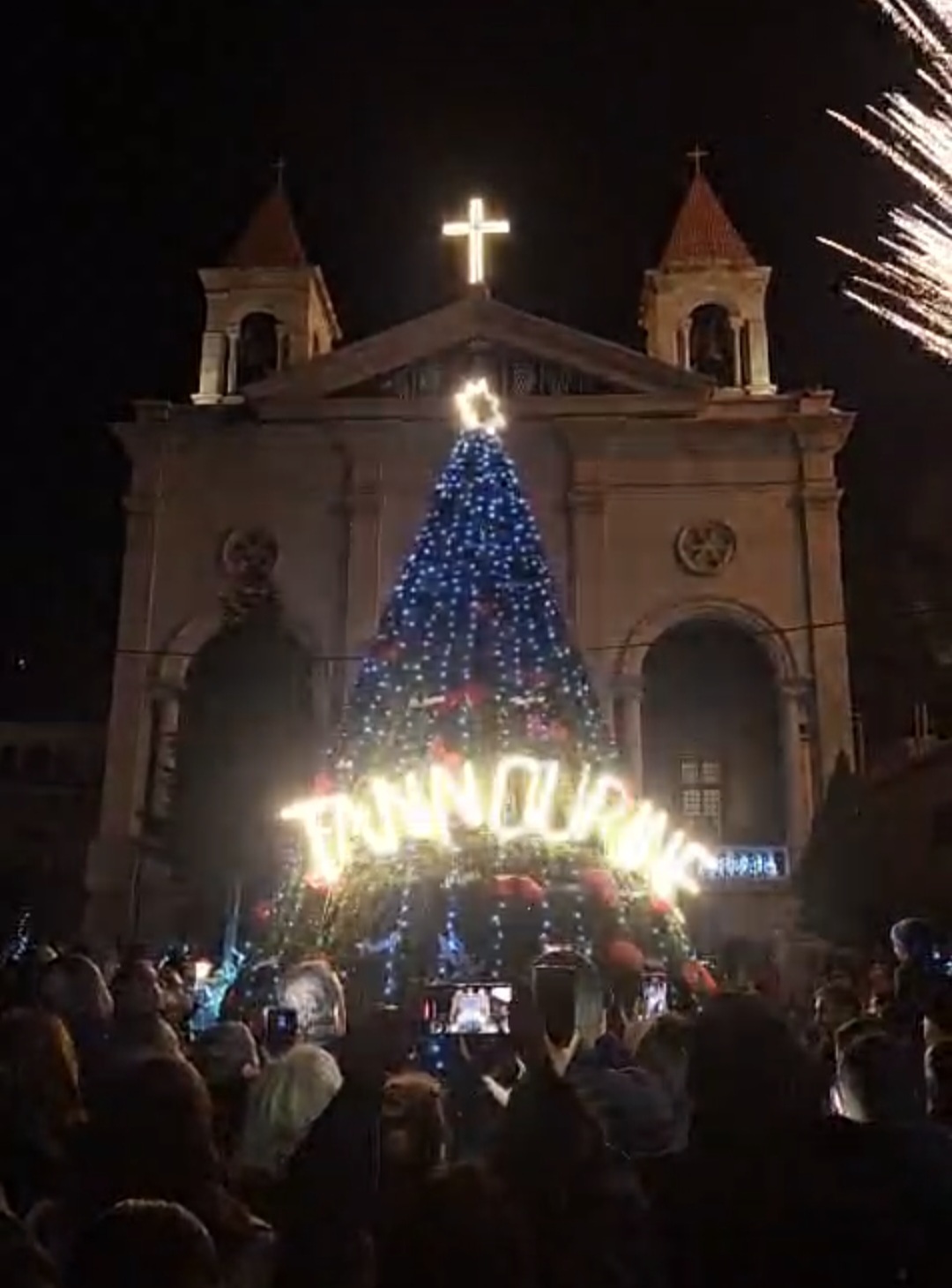 وشجرة الميلاد وقفت شامخة في الساحة امام كنيسة سيدة الانتقال، كأنها وعدٌ أخضر بالحياة مهما اشتدّ البرد وقست الظروف.