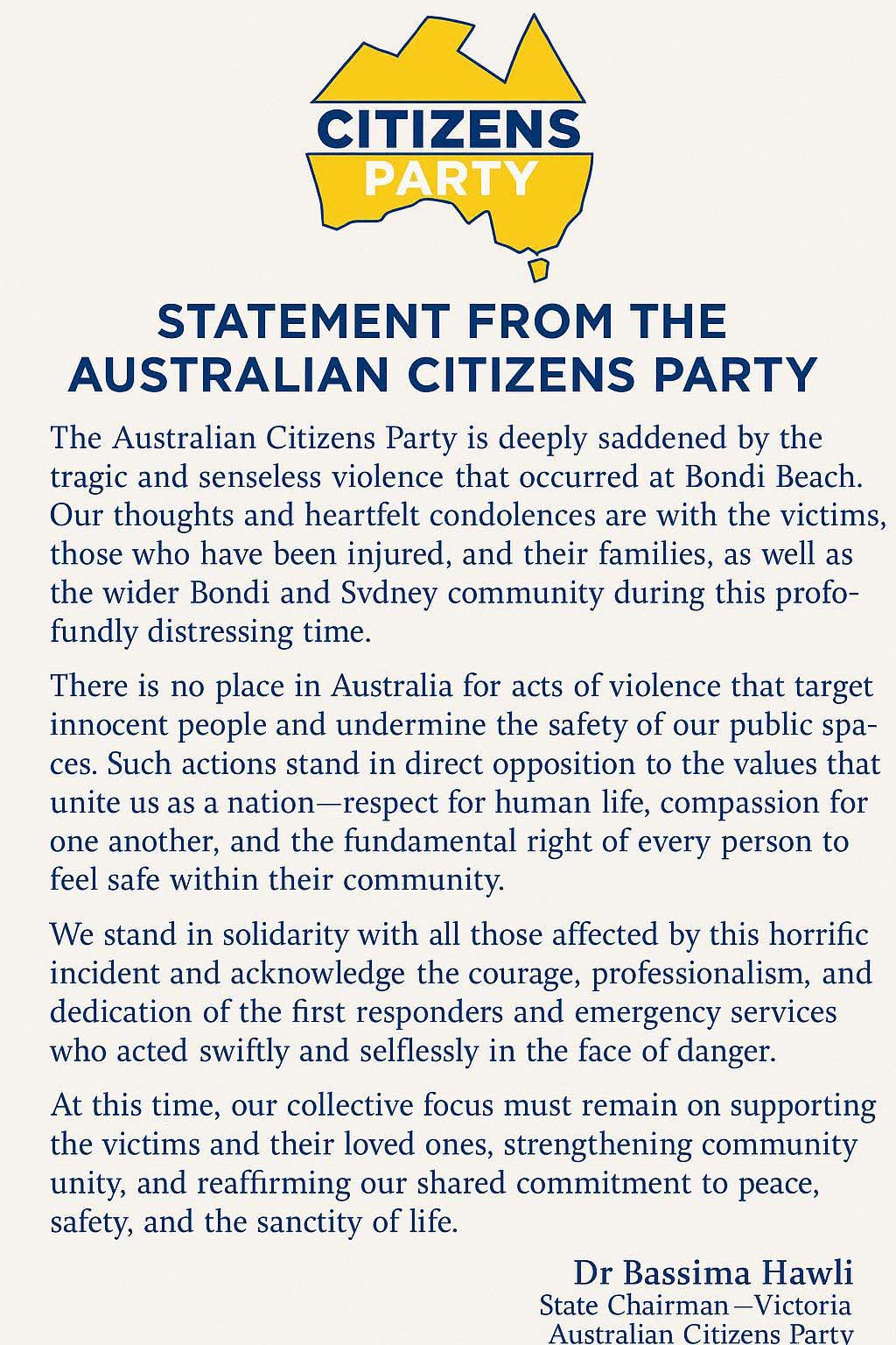 يشعر حزب المواطنين الأسترالي بحزن عميق إزاء أعمال العنف المأساوية والعبثية التي وقعت على شاطئ بوندي. نتقدم بخالص التعازي والمواساة للضحايا والمصابين وعائلاتهم، وكذلك لأهالي بوندي وسكان سيدني في هذا الوقت العصيب.