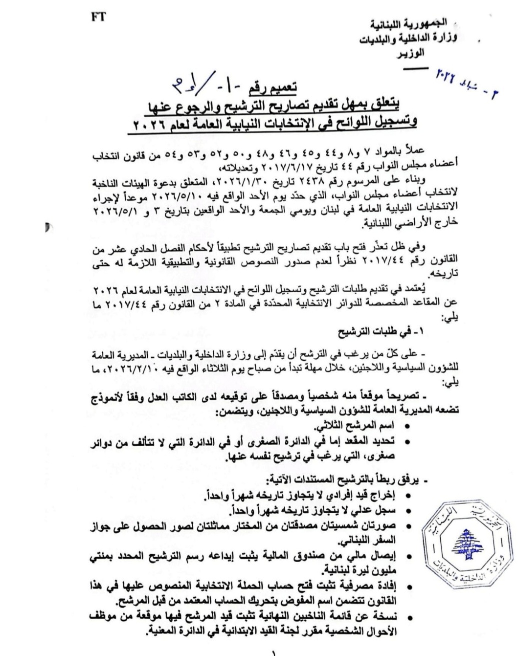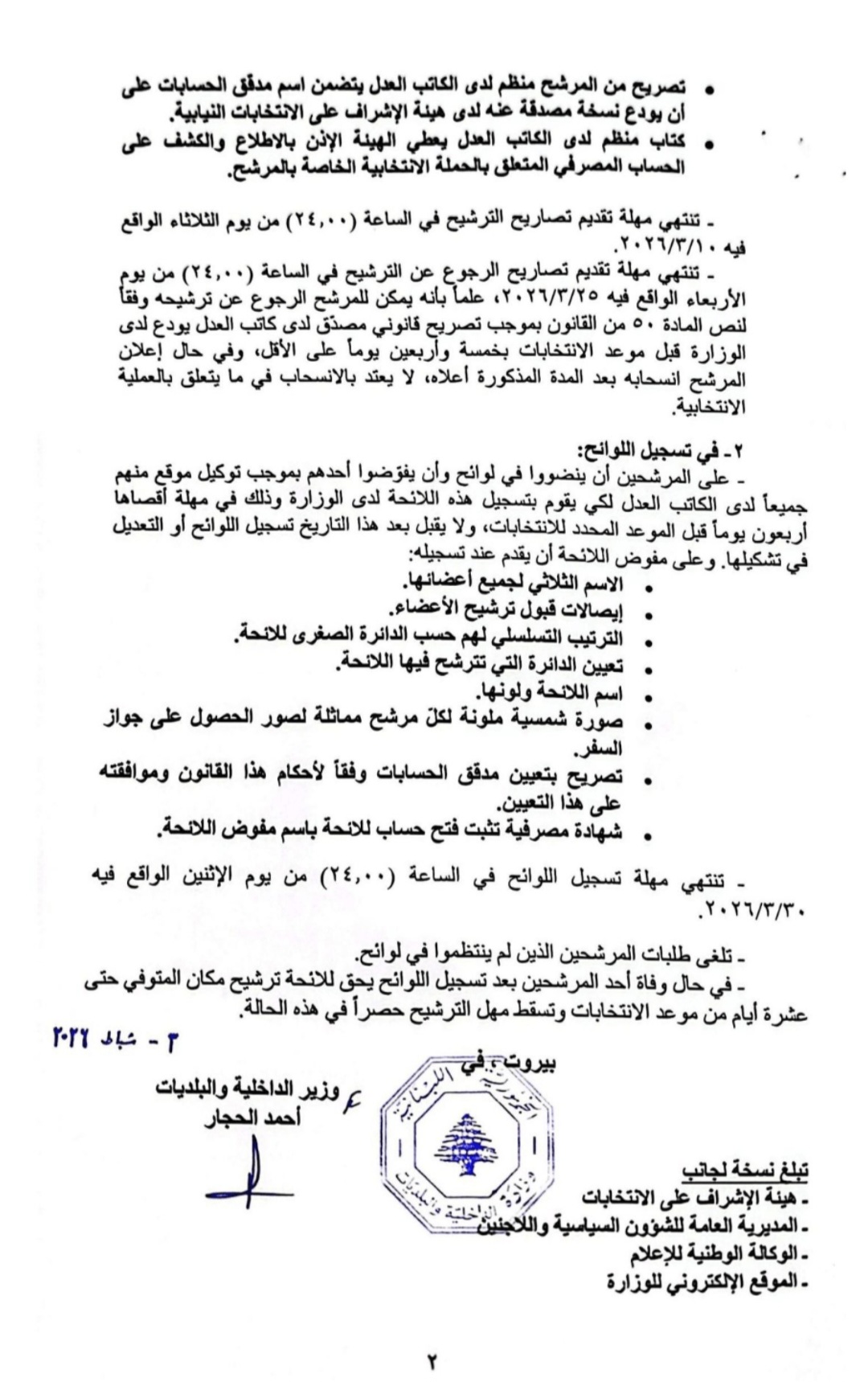 أصدر وزير الداخلية والبلديات أحمد الحجار تعميماً حدّد فيه مهل تقديم تصاريح الترشيح والرجوع عنها، وتسجيل اللوائح للانتخابات النيابية العامة لعام 2026.