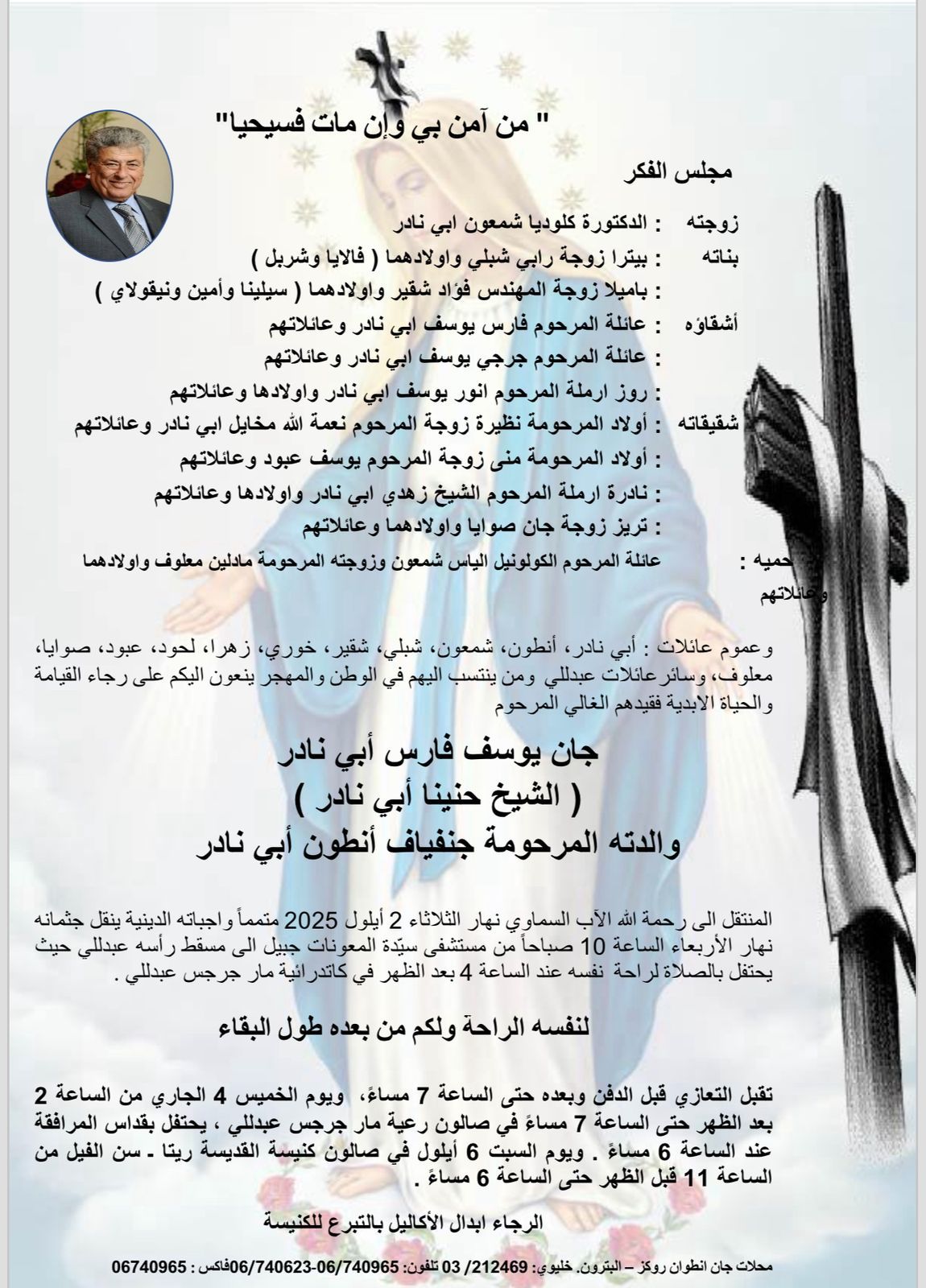 العزاء الصادق لزوجته ورفيقة دربه ورئيسة مجلس الفكر – لبنان، الدكتورة كلوديا شمعون أبي نادر، وللأهل والأنسباء، ولأعضاء مجلس الفكر، ولأهل القلم والأحبّة جميعاً.