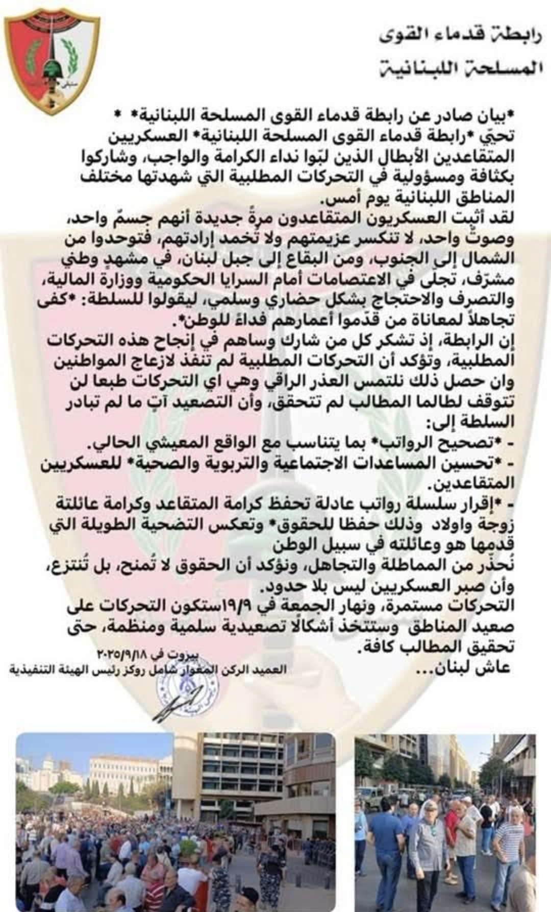 تحيّي *رابطة قدماء القوى المسلحة اللبنانية* العسكريين المتقاعدين الأبطال الذين لبّوا نداء الكرامة والواجب، وشاركوا بكثافة ومسؤولية في التحركات المطلبية التي شهدتها مختلف المناطق اللبنانية يوم أمس.