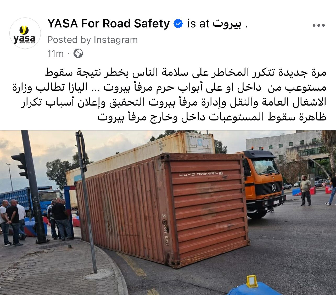 مرة جديدة تتكرر المخاطر على سلامة الناس بخطر نتيجة سقوط مستوعب من داخل او على أبواب حرم مرفأ بيروت … اليازا تطالب وزارة الاشغال العامة والنقل وإدارة مرفأ بيروت التحقيق وإعلان أسباب تكرار ظاهرة سقوط المستوعبات داخل وخارج مرفأ بيروت