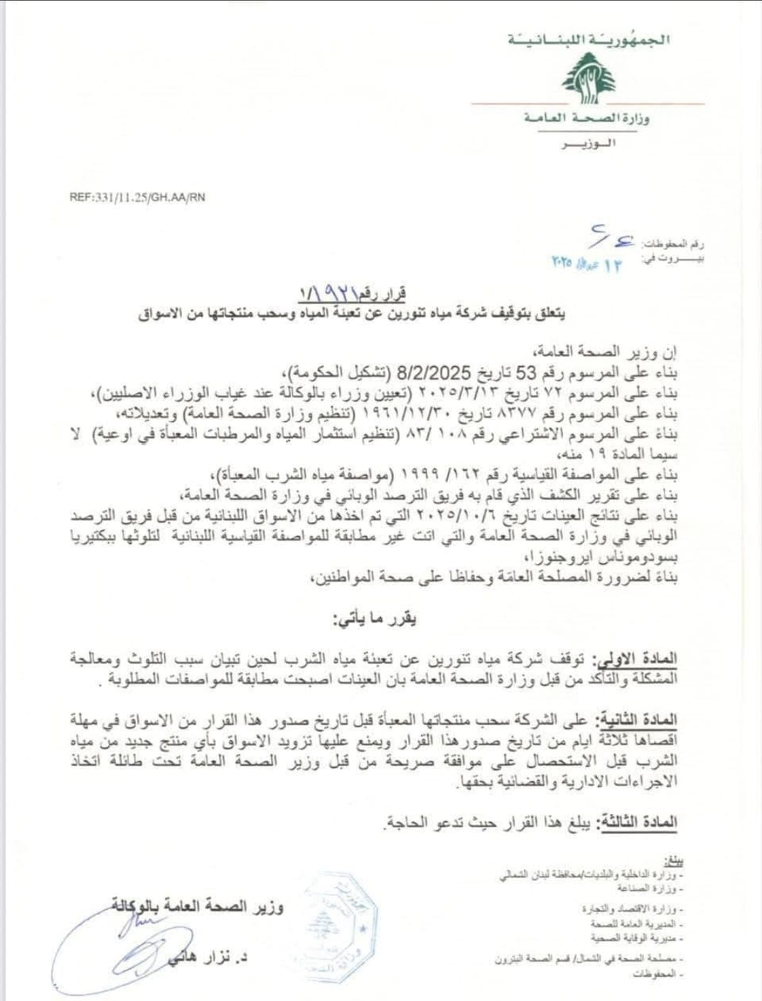 اشارت بعض الأنباء ان الاخبار المتداولة حول صدور قرار بتوقيف العمل في شركة “مياه تنورين” وسحب منتجاتها من الأسواق بسبب التلوث غير صحيحة إطلاقًا ونشرت الشركة نتائج فحوصاتها قبل اسبوع،علما ان صفحة وزارة الصحة على الفايسبوك هي من نشرت القرار فهل يعقل ان يكون مفبركا؟