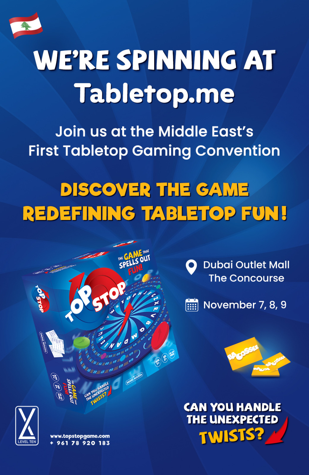 يسرّني أن أعلن أنّني سأشارك مع فريقي في أوّل معرض ومؤتمر للألعاب اللوحية في الشرق الأوسط “Tabletop.me”، الذي سيُقام من 7 إلى 9 تشرين الثاني المقبل في دبي، حيث ستكون Top Stop اللعبة اللبنانية الوحيدة بين أكثر من 50 مشاركاً من دول العالم والعلامات التجارية العالمية، مع توقّع حضور كبير جداً .