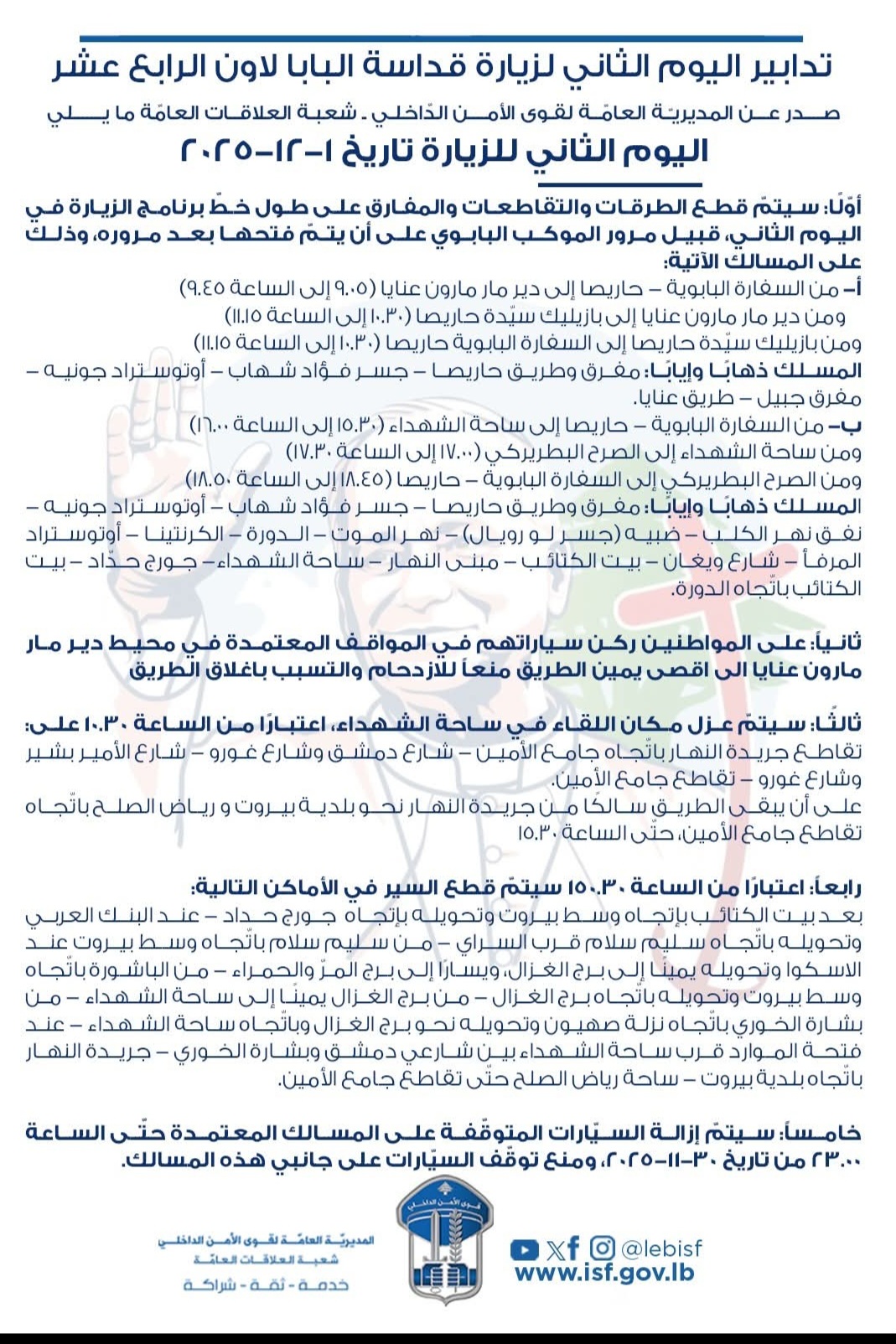 اعلنت المديرية العامة لقوى الأمن الداخلي في بيان تدابير سير لليوم الثاني والثالث لزيارة البابا لاوون الرابع عشر لبنان.